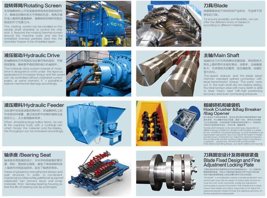 環(huán)創(chuàng)DS系列雙軸撕碎機(jī)可滿足各行業(yè)的廢料回收要求,適合撕碎較厚難碎的物料如:電子垃圾、硬質(zhì)塑料、金屬、木材、廢舊橡膠、包裝桶、托板等?苫厥詹牧戏N類繁多,經(jīng)撕碎后的物料可直接回收或根據(jù)需求作進(jìn)一步細(xì)化處理。適用于工業(yè)廢棄物回收、醫(yī)療回收、電子制造、托板制造、木材加工、生活垃圾回收、塑料回收、輪胎回收、造紙等行業(yè)的應(yīng)用。該系列雙軸撕碎機(jī)擁有低速、大扭矩、低噪音等特點(diǎn),采用西門子編程系統(tǒng),可以自動(dòng)控制、設(shè)有啟動(dòng)、停止、反轉(zhuǎn)以及超載自動(dòng)反轉(zhuǎn)控制功能。